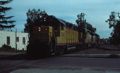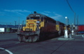 SP SD7R 1508 and a GP9E come around the corner in front of the Santa Fe's Fullerton depot on the UP's Anaheim Branch in 1980. This location is where the overhead bridge is at the depot today. While a segment of the UP's branch remains between Basta and Fullerton, it is now a car storage track connected to the Santa Fe's south main track. |