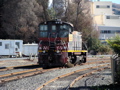 New Napa Valley GP9 69 runs around its single car train at St Helena. The Quattro Vino stops at four wineries, but has to get out of the way of the normal wine train, so after running around the train, the 69 will push the train to the end of the track at Krug. |