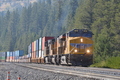 A long 123 platform stack train with 8066-2576-5147 and 2 5200's at the rear rolls through Soda Springs, CA on the long descent through the Sierra. |