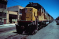 An SP sugar beet train moves south from Magnolia Tower onto Jack London Square. GP9E 3303 leads two SD45T-2's and those famous wood side beet racks. |