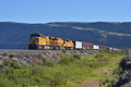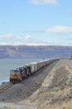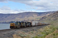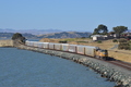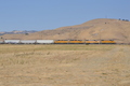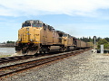 UP 4877-4253 pull the ribbon rail train through the curves at Hercules. |